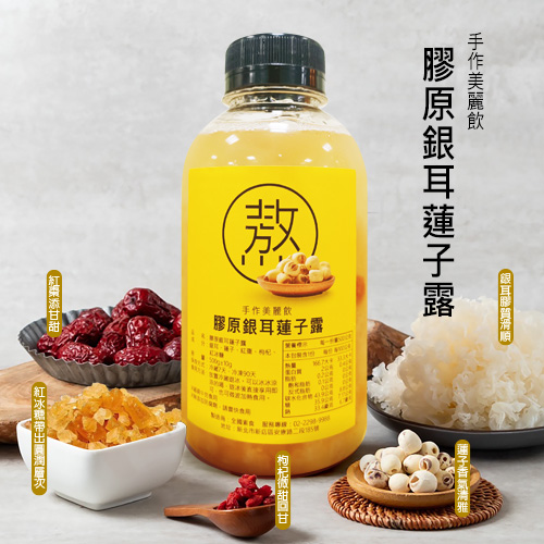 膠原銀耳蓮子露 職人手作:加入銀耳、蓮子、枸杞、紅棗慢火熬煮4至6個小時,吃的到濃稠精華真材實料。 保證好吃!!豐富的植物性膠質屬於多醣體的成分,擁有極佳保水性,是很天然的養顏美容飲品。